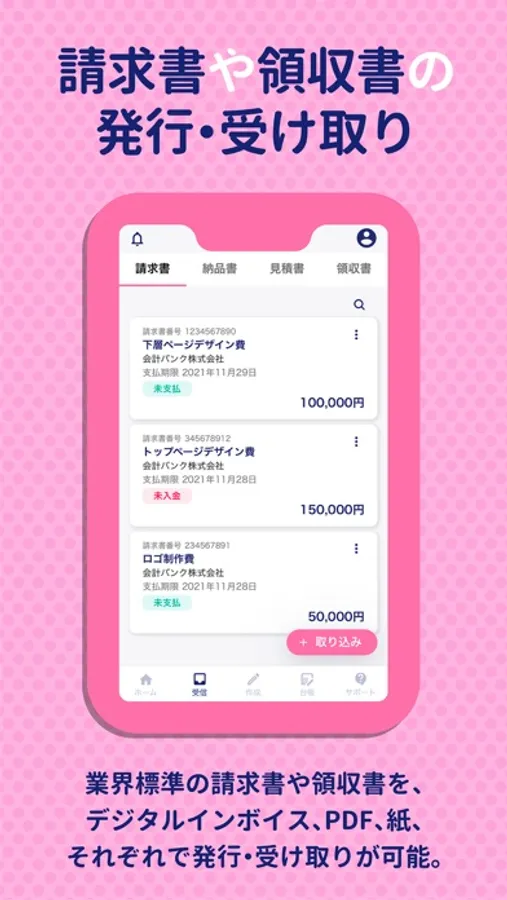・受信画面で、受け取った請求書や領収書など一覧確認。写真撮影で簡単にデータ登録