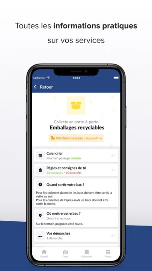 L’application vous donne automatiquement le jour du prochain passage du camion pour les collectes d’ordures ménagères, les emballages, les déchets végétaux, les encombrants et le verre. Vous avez également accès au planning annuel des collectes, avec prise en compte des jours fériés.