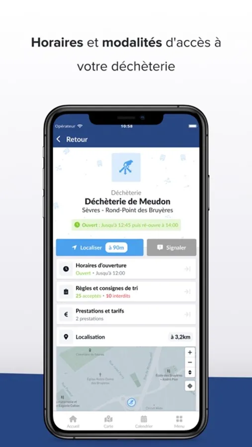 L’application recense les points de collecte les plus proches de vous grâce à la géolocalisation, et vous donne les règles et consignes de tri pour le verre, le textile, les journaux et magazines, les ordures ménagères et les emballages. Vous découvrirez peut-être des lieux où donner vos vêtements ou échanger vos livres, comment opter pour le compostage, se débarrasser d'un vieux matelas ou tout autre encombrant et que faire des piles, médicaments, etc. Enfin, vous n’aurez plus de doute sur les horaires d’ouverture des déchèteries : la bonne information est dans l’application !