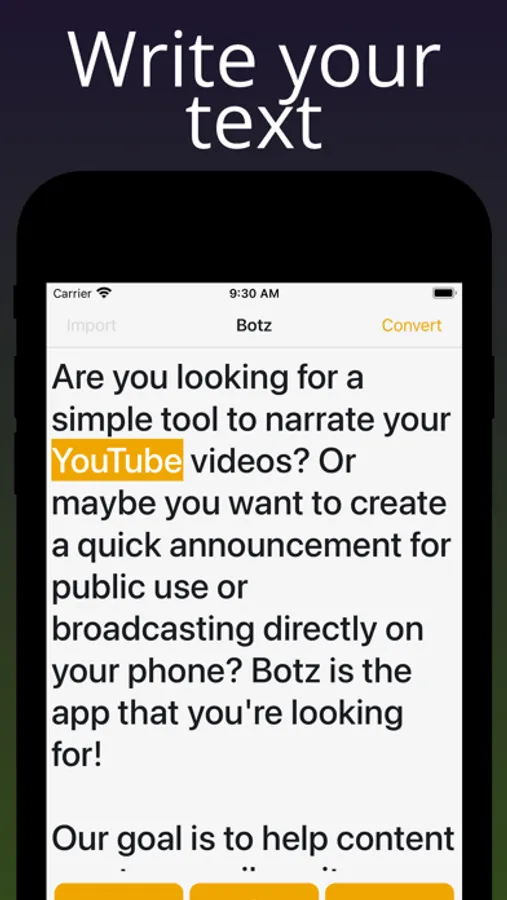Our mission is to empower content creators with a straightforward tool that lets you write a script and effortlessly save it as an audio file, all while offering unparalleled customization options. Unlike other apps that charge a hefty sum or require a subscription for text-to-audio conversions, Botz offers a refreshing difference – unlimited access to all voices, including high-quality ones, and the freedom to convert your text as many times as you need.