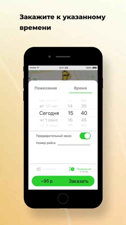 Нужен автомобиль к определенным времени и дате? Закажите его заранее через приложение, и в назначенное время такси будет ждать вас у подъезда.