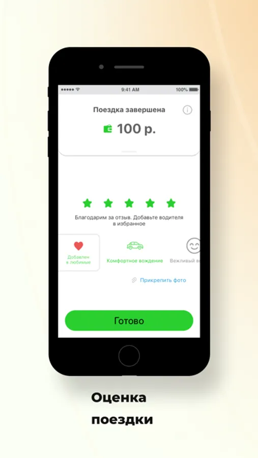 Оценивайте поездку с помощью готовых шаблонов. Занесите водителя в “Избранные”, если понравилась поездка, или поблагодарите его чаевыми.