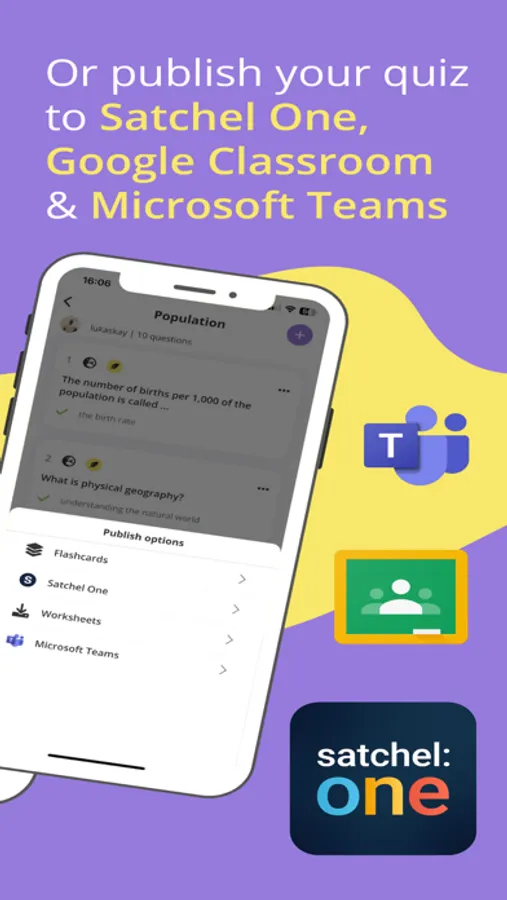 Export your classroom quiz as online flashcards or printable PDFs. Or publish directly to your school’s learning platform, be it Google Classroom, Microsoft Teams or Satchel One.