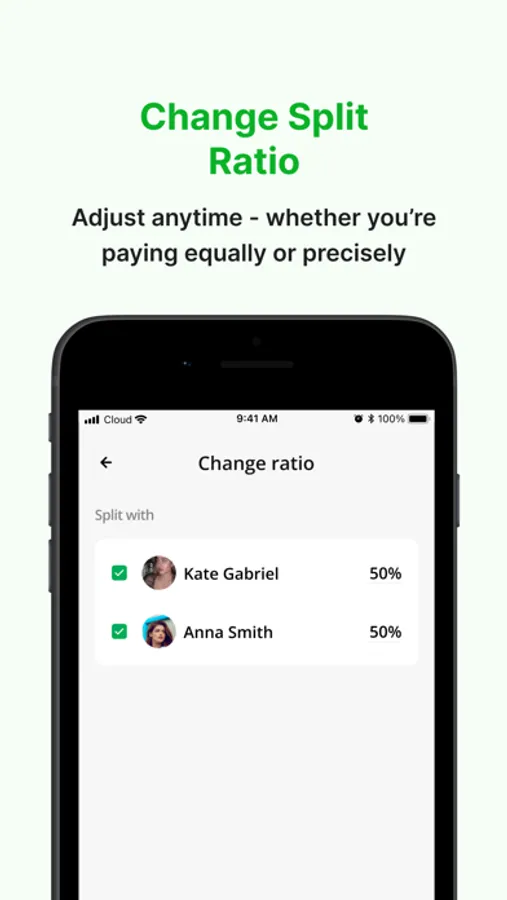 Change the amount that each user pays anytime – so whether you're splitting equally or precisely, you only ever pay your share.