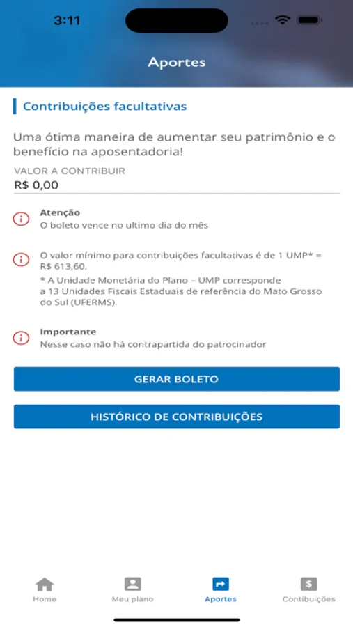 Outra facilidade é realizar uma contribuição facultativa. No aplicativo, o participante pode fazer um aporte gerando um código de barras, de forma simples e rápida.