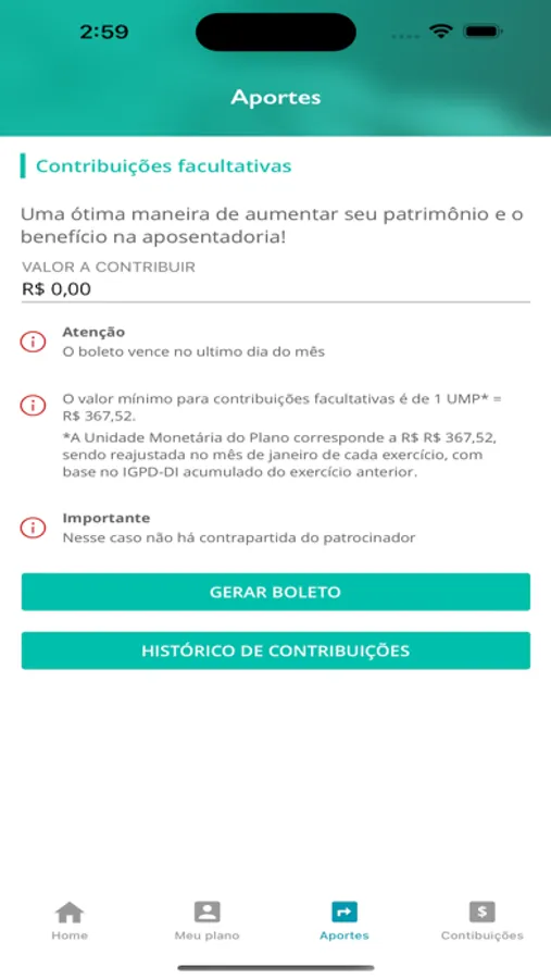 Outra facilidade é realizar uma contribuição facultativa. No aplicativo, o participante pode fazer um aporte gerando um código de barras, de forma simples e rápida.