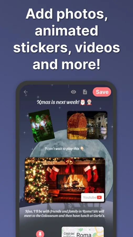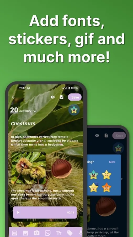 Decorate diary pages with images and stickers. You can add static and animated stickers or gifs! Easily make your diary journal more memorable.