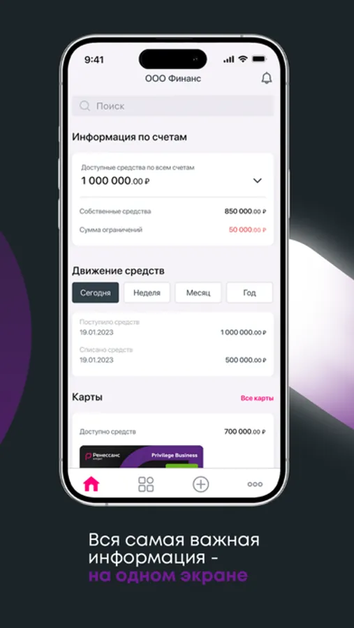 • Вся самая важная информация – на одном экране. Это позволяет буквально за несколько секунд отслеживать все операции по счёту с денежными средствами, в том числе, с использованием бизнес-карты.