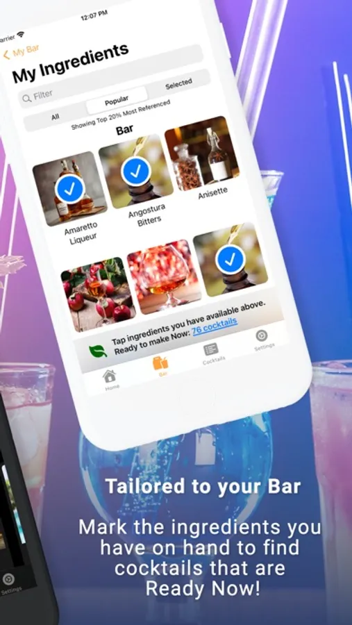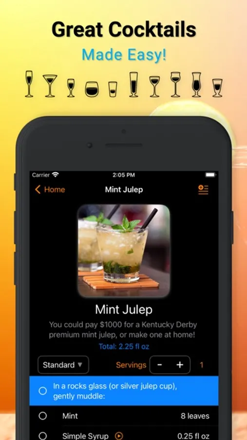 Vector Bar's recipe view is designed for making cocktails, with step-by-step instructions in the precise order you need them. Check off each step to see your progress and keep track of exactly where you are in a recipe, so you'll never accidentally forget a pour again!