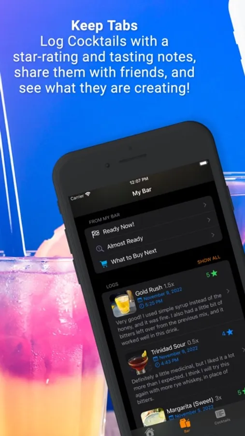 Keep notes, photos, and star ratings for each drink you mix so you can learn how to improve your craft and tailor it to suit your tastes for the next round. Add Your Friends to see what cocktails they are logging and to give them Cheers. Ratings, Photos, and Notes are instantly shared in the app between you and your friends.