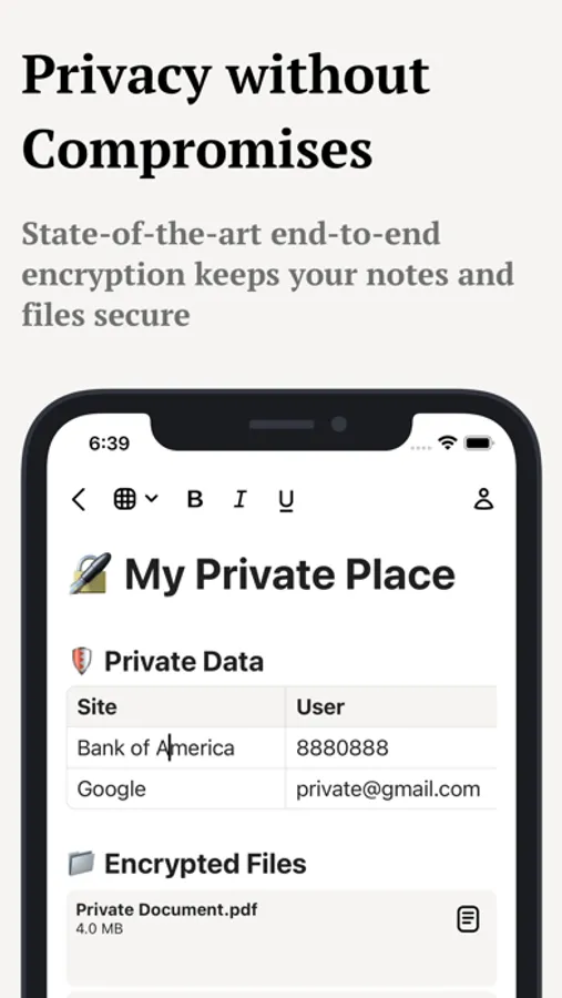 State-of-the-art end-to-end encryption keeps your notes and files secure. We can't read your notes or access to your files, and no one else can either. Privacy isn’t an optional mode - it’s just the way that SNote works. Every note, every file, every time.