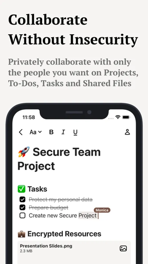 Privately collaborate with only the people you want on Projects, To-Dos, Tasks and Shared Files. All with an unexpected focus on privacy, combined with all of the features you expect. All with a realtime end-to-end encryption. We call it eye-to-eye.