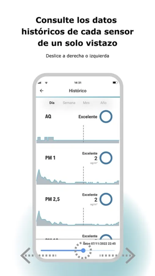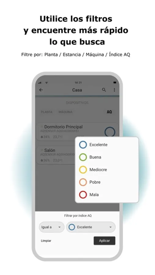 App intuitiva con gráficos, consulte los datos históricos de cada sensor de un solo vistazo. La aplicación ha sido diseñada para mostrar el estado de la instalación y registrar cualquier cambio que haya podido ocurrir. Utilice los filtros y encuentre más rápido lo que busca, filtre por: Planta / Estancia/ Máquina/ Índice AQ.