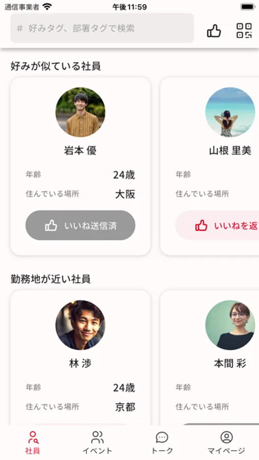 他者のプロフィールを閲覧することで、他者のことをより良く理解できるようになり、相手にコンタクトを取りたいと思えば、「いいね」を送ることができます。相手も「いいね」を返してくるとマッチングが成立し、ダイレクトでコミュニケーションを図ることができるようになります。また、アプリ登録者が増えていくことに従い、自分と趣味や興味関心が似ている人をアプリが自動的にレコメンドしてくれるようになり、人を探す時間を短縮することができるようになります。社内で今まで出会ったことがない人であっても、自動でレコメンドしてくれることでお互いの共通項を見つけることができ、人脈を広げるきっかけを与えてくれます。