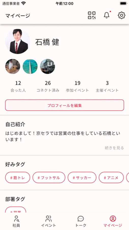 まずは、社員個々人がアプリ内で本人顔写真や自己紹介文を登録します。次に、本人の好みや興味、部署名などをアプリ内でタグを作成していくことで、他者から見て自分自身を詳しく説明するためのプロフィールが完成します。