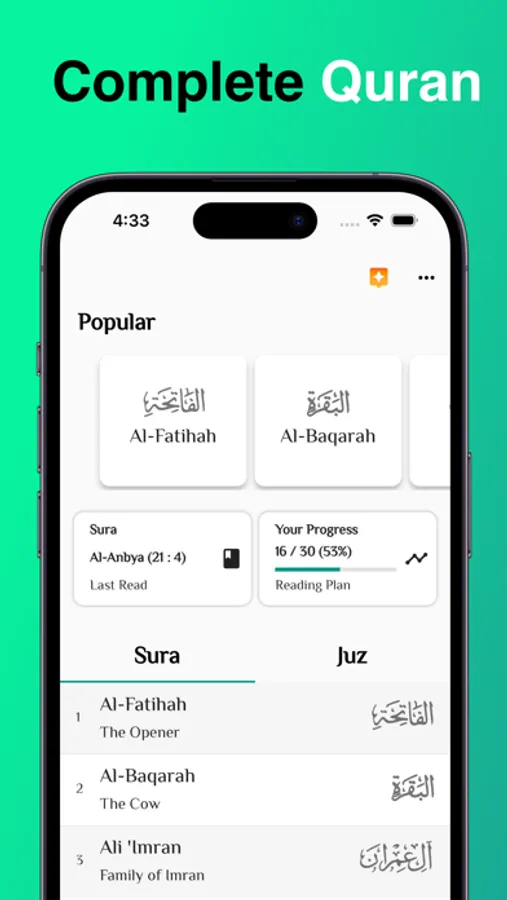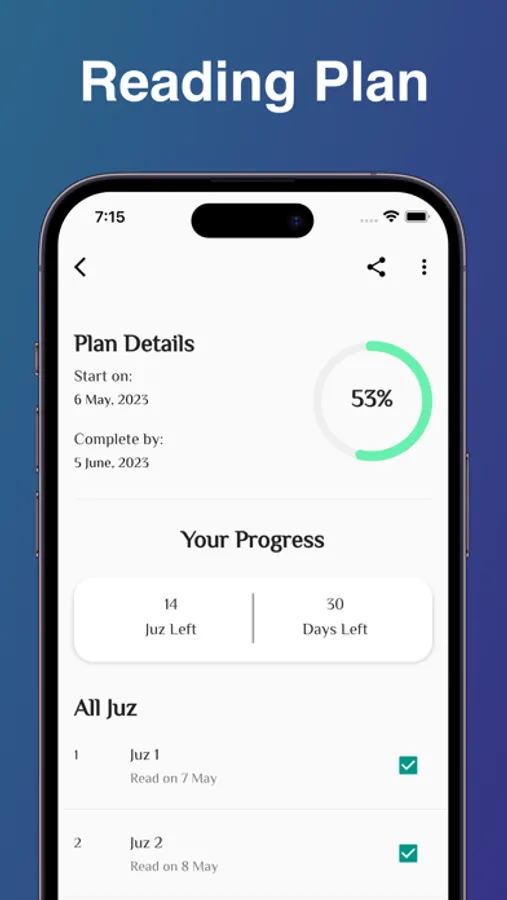 • Guided Reading: A personalized Reading Plan, tailored to your pace and preferences, serves as a steady compass, helping you traverse the entire Quran and cherish each step of your profound spiritual voyage.