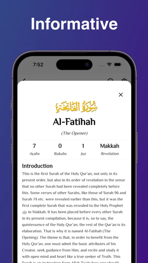• Enlightening Introductions: Embark on a profound exploration with proper details and introductions for each Surah, a treasure map guiding you through the rich context and revelation of these sacred chapters.