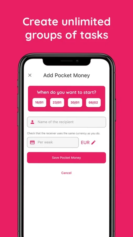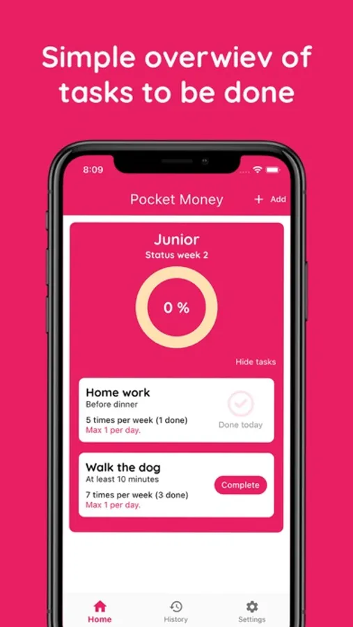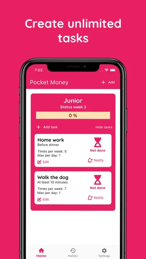 Create a collection of tasks to be completed during the week. You can follow what is being done and remind them in the app if it is forgotten. Pay them at the end of the week if everything is done. You can also create single tasks to be performed once. Parents can work together to follow up all the tasks.