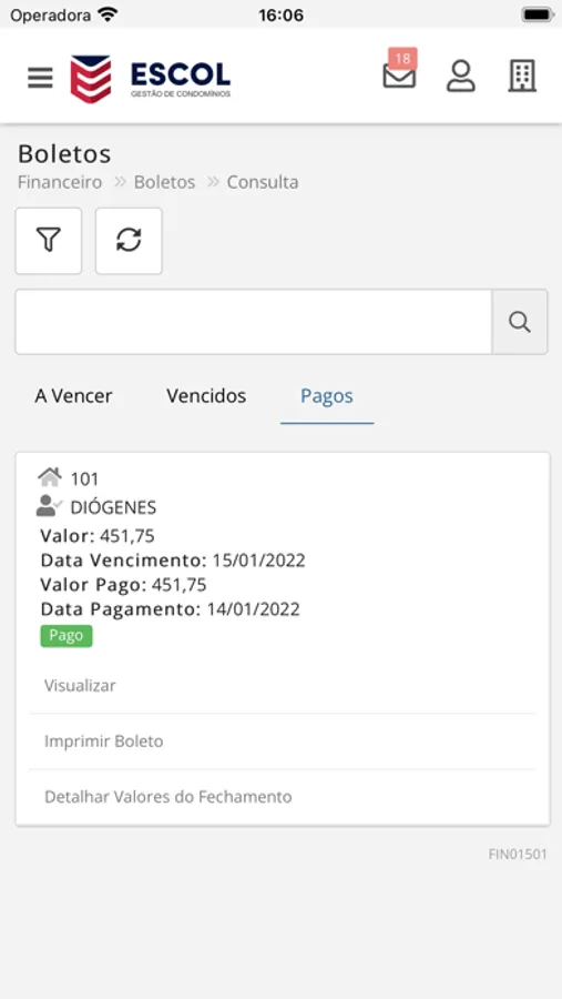 - Visualização de boletos em aberto para sua unidade;