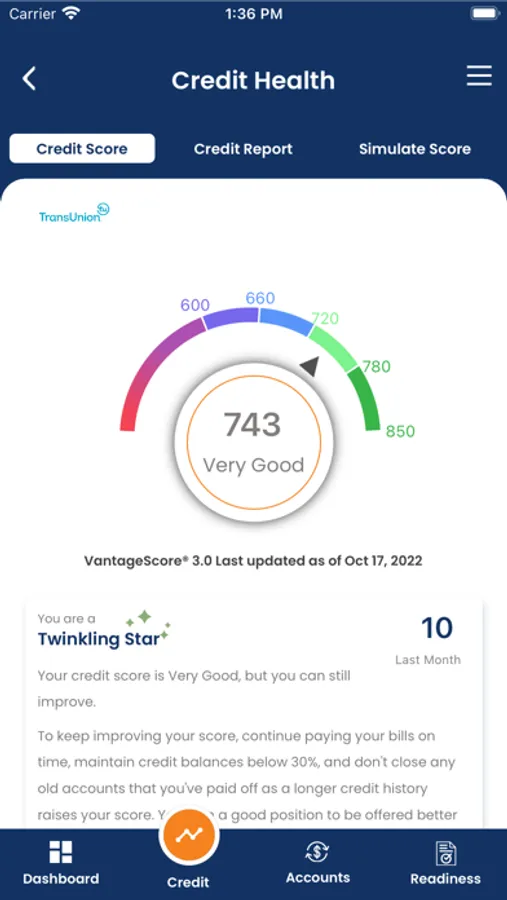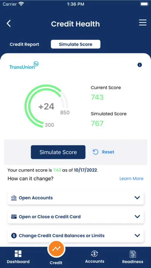 Your credit score is prominently displayed in your dashboard - and it doesn't cost you anything. Track changes month to month and learn the key factors that make up your score like length of credit, timely payment history, utilization of credit, total accounts opened and inquiries. Don't worry, this is a "soft credit pull" meaning there is no impact to your score by checking it. Look through your credit report for accuracy. Access helpful articles that explain credit bureaus, credit score, and more.