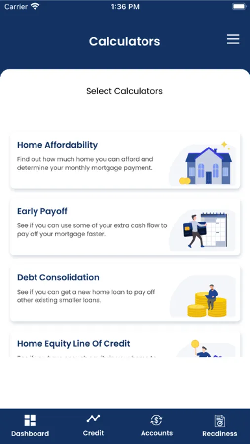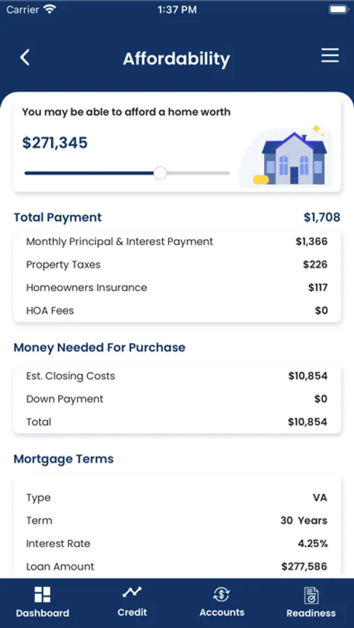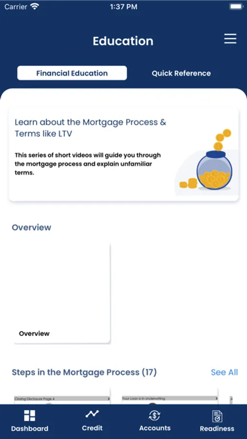 Work with your financial partner or institution to best prepare you to Secure Home ownership by planning for a down payment, establishing reserves, managing your debt to income ratio, improving or maintaining your credit, loan scenarios through our calculators, establish your projected loan to value, and more. Visit the readiness assessment in your app to see a snapshot of your credit overview, debt to income ratio, cash reserves, employment, down payment and sales price.