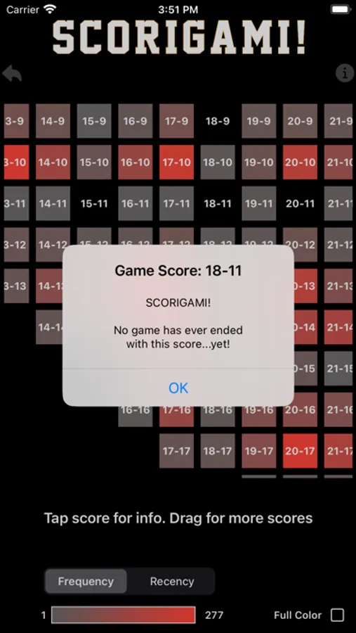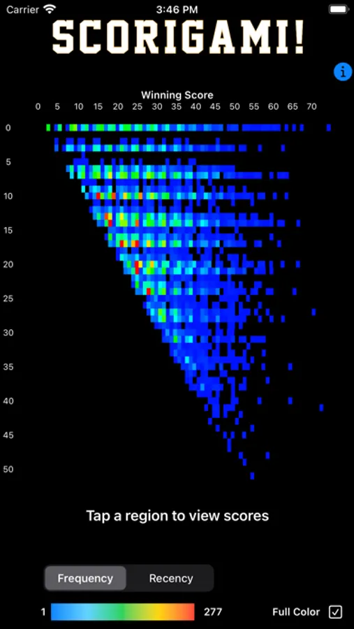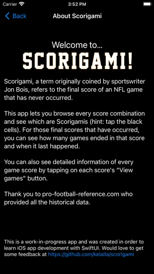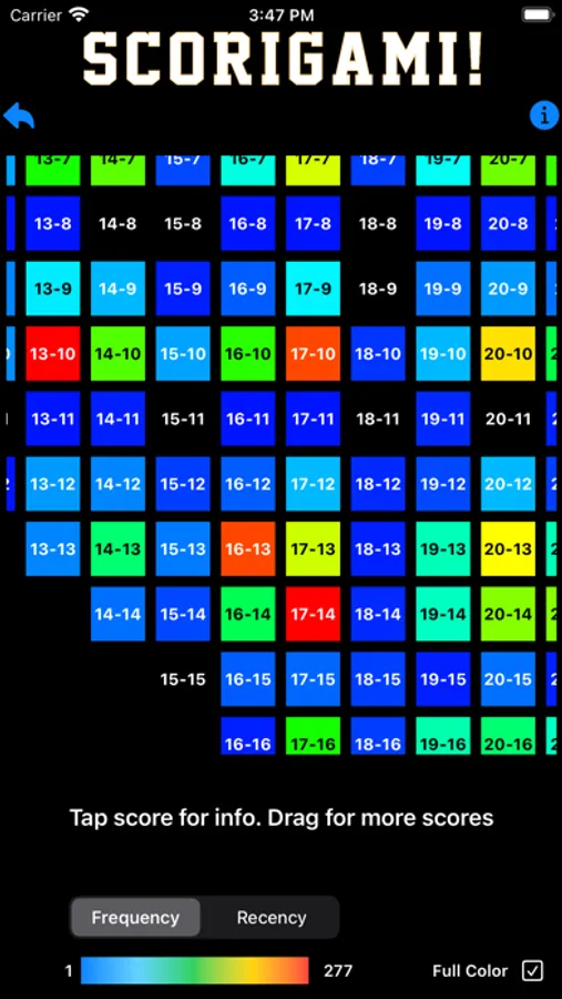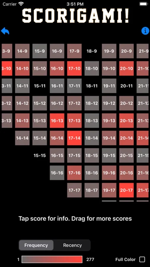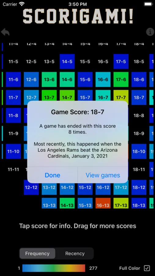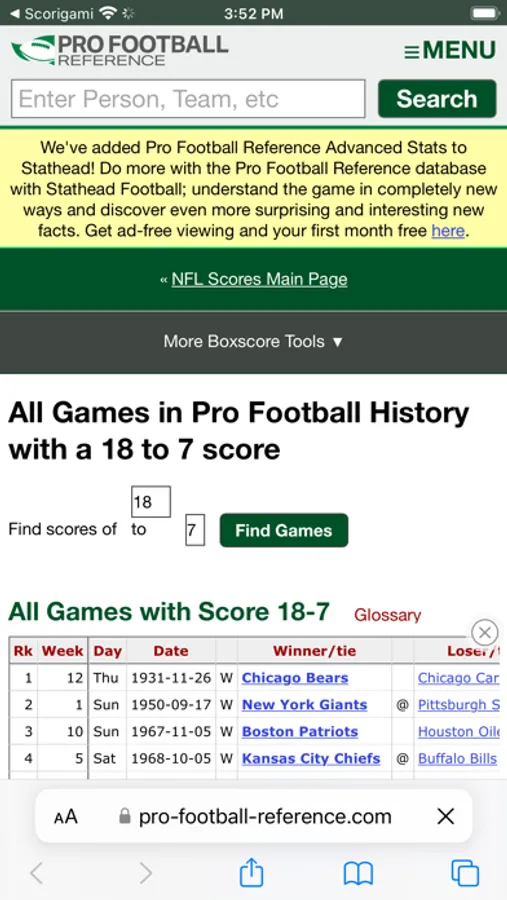 Scorigami lets you quickly see all the NFL final scores that have NEVER happened. You can also see how many times any other score combination has occurred and view all the games for that score. A Scorigami is a rarity in the NFL these days, so follow along your games with this app to see if it's headed in that direction! Credit to Jon Bois who coined the term and to pro-football-reference.com for the historical data.