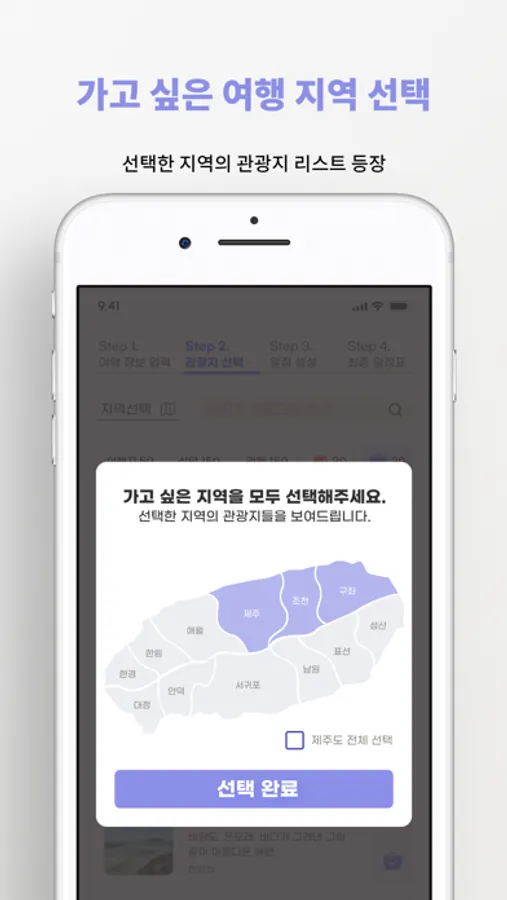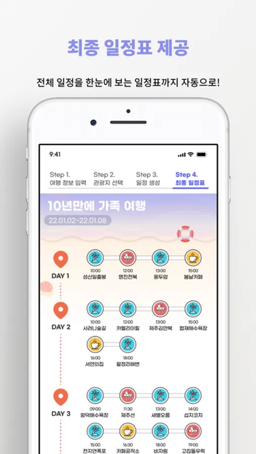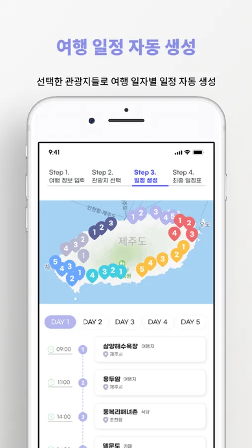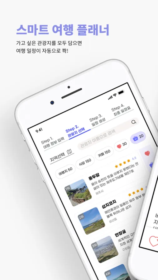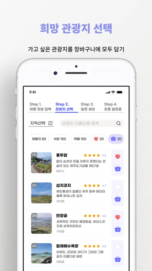 더 이상 여행 일정 세우는 데 스트레스 받지 마세요. 이번 여행에서 가고 싶은 관광지들을 모두 장바구니에 담기만 하면 올 어바웃 제주가 자동으로 최적의 경로로 전체 여행 일정을 만들어드립니다.