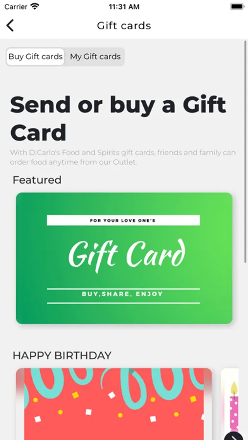 This is a food ordering app for DiCarlo's Food and Spirits. All you need is this app and you can order food when you feel like it or you can schedule it for later. Log in and enjoy the best food from DiCarlo's Food and Spirits.
