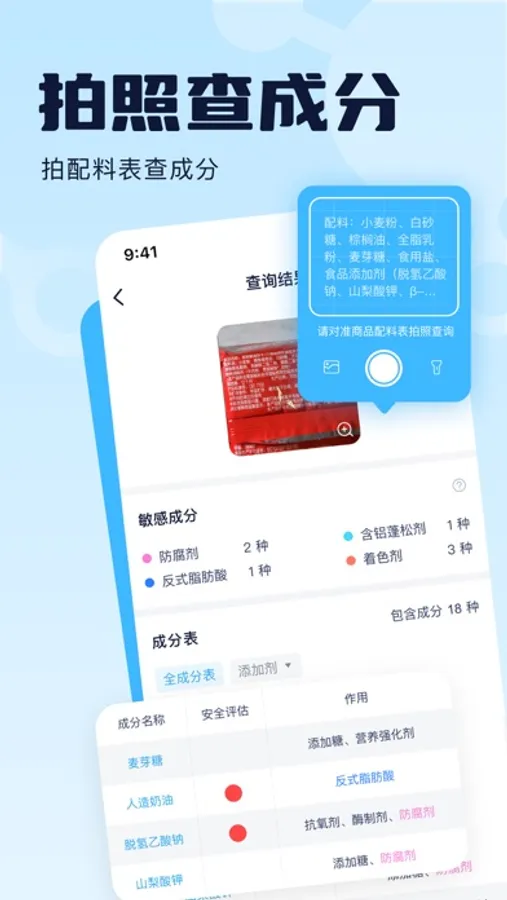拍摄产品配料表或成分表,成分喵将自动识别产品成分,算法解读各成分的详细信息,快速方便,让您随时随地了解正在使用的产品。