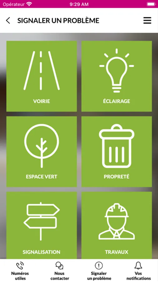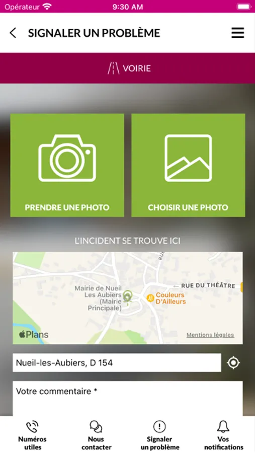- Signaler un problème à votre mairie en envoyant des photos géolocalisées : voirie, éclairage public, espace vert, propreté, signalisation, travaux, stationnement …