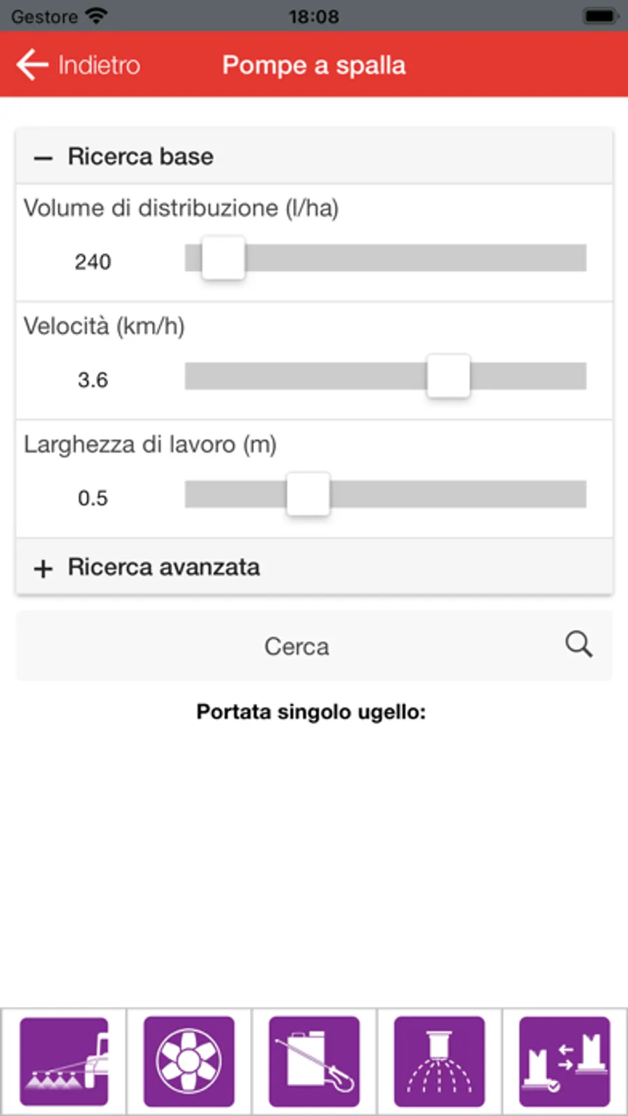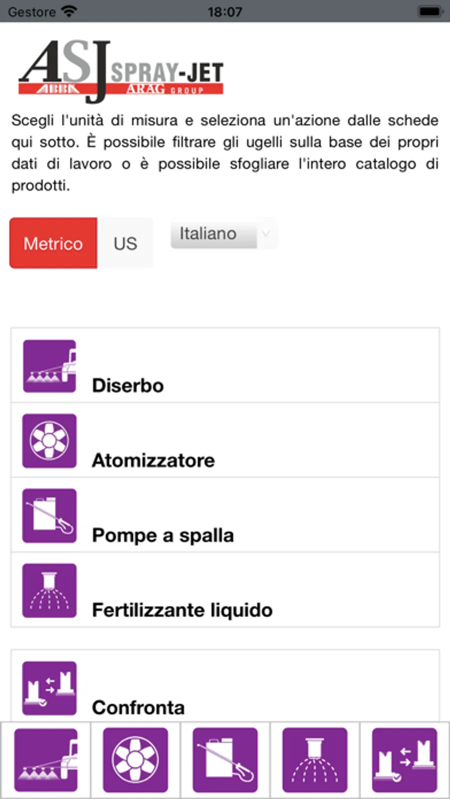 Il configuratore ASJ NOZZLE ti aiuta ad individuare il corretto ugello in base alle tue necessità di utilizzo. L’App consente di selezionare l’unità di misura e l’azione che ti interessa: diserbo, atomizzatore, pompe a spalla e fertilizzante liquido. Attraverso una ricerca base o una ricerca avanzata, l’applicazione restituisce un elenco di ugelli in linea con i dati di lavoro inseriti.