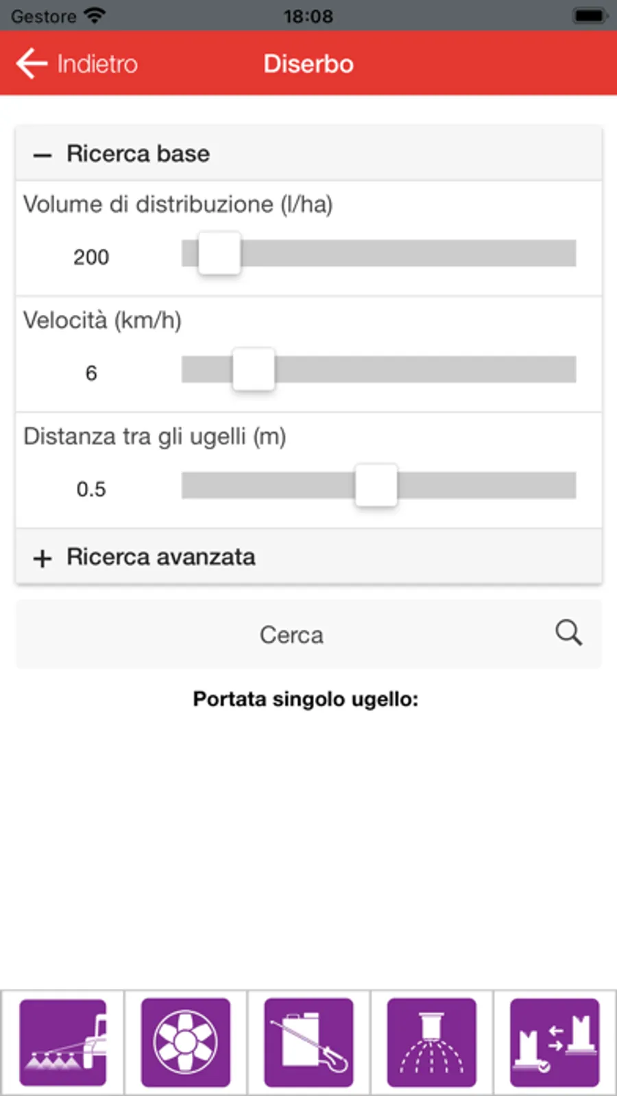 - Diserbo: volume di distribuzione, velocità, distanza tra gli ugelli, intervallo di pressione, materiali, forma del getto e dimensione goccia.