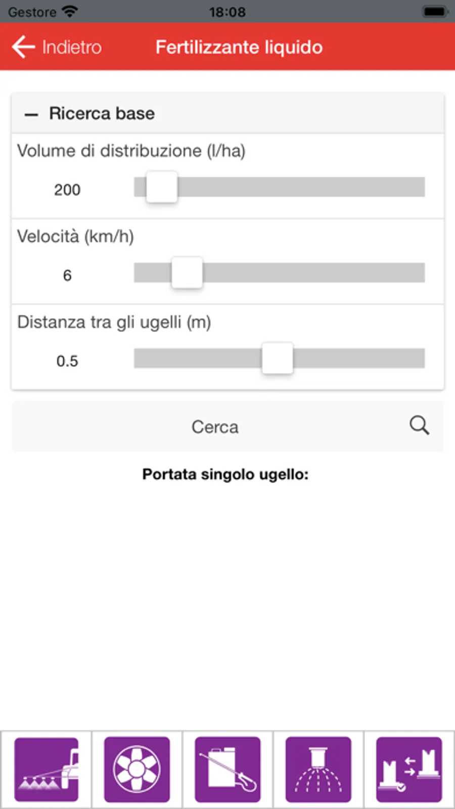 - Fertilizzante liquido: volume di distribuzione, velocità e distanza tra gli ugelli.