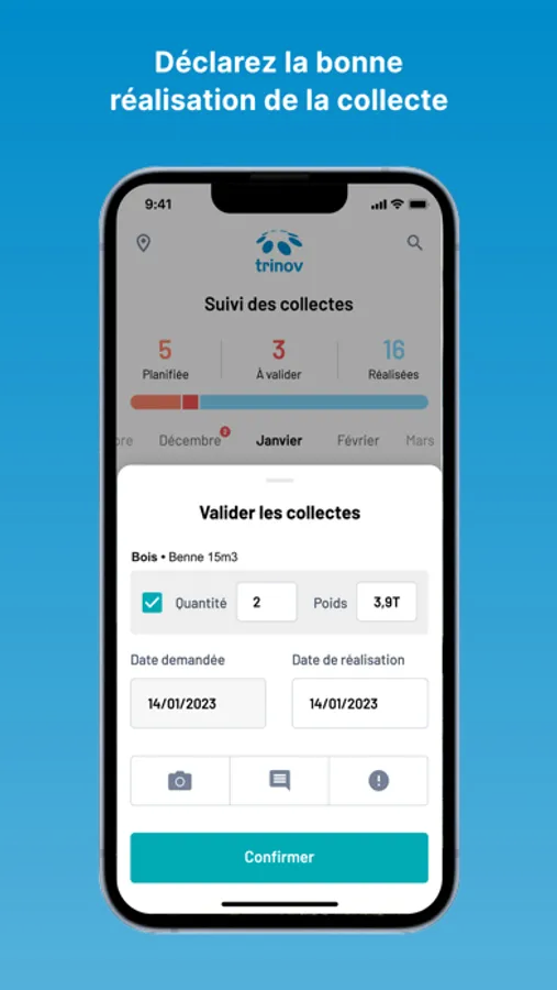Lors de la collecte, vous pouvez déclarer sur l’application qu’elle a bien été effectuée, joindre des photos des déchets ou des documents de l’enlèvement.