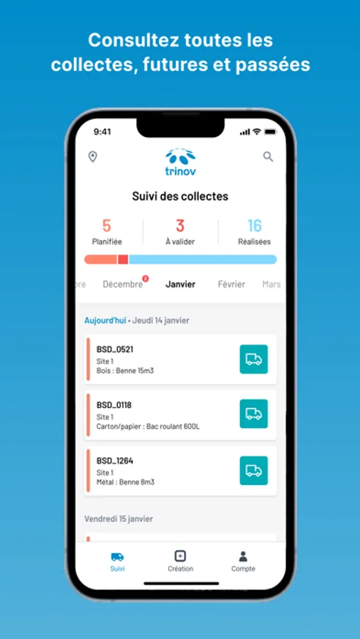 Faites vos demandes de collectes pour tous vos déchets directement depuis votre mobile et consultez les confirmations de vos prestataires de collecte.