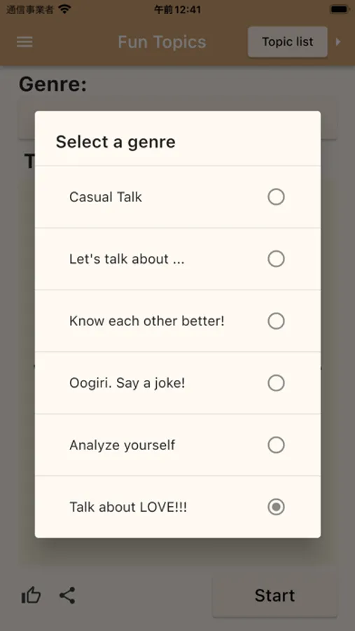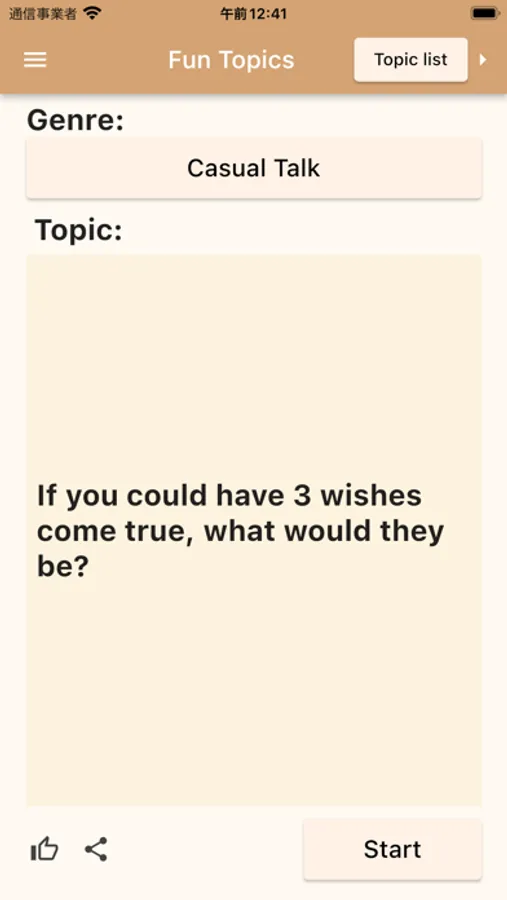 Press the Start button in the main page, and then a topic is picked randomly. Talk about it with friends, family, partner, and so on!
