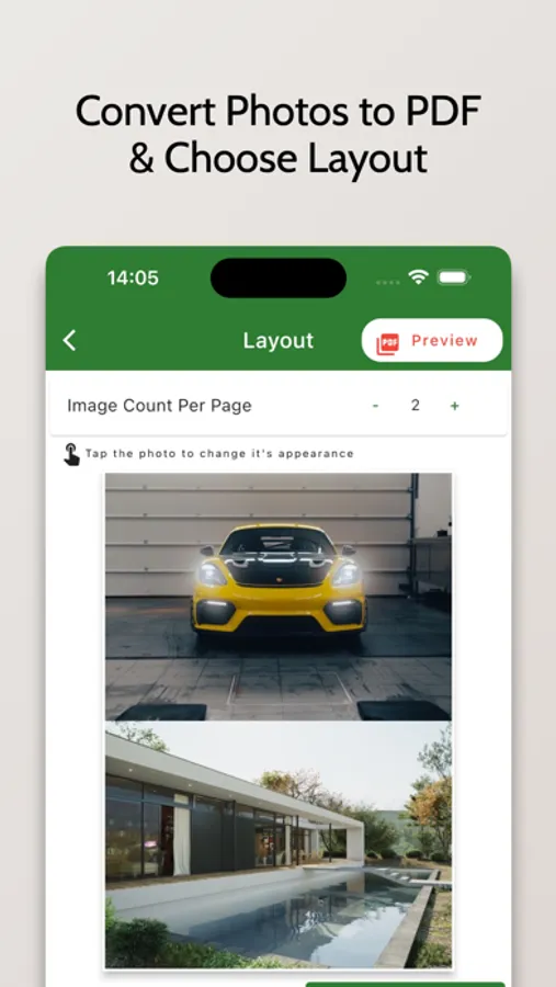 Use "Photos to PDF Converter & Scan" to scan photos or documents from your camera or add them from your photo gallery. Choose the count of photos per page and select layout of pages, including pre-defined Photo Grid layouts. You can resize images with medium or small file size option and choose to fit or fill the image on the page or in the Photo Grid by tapping the photo.