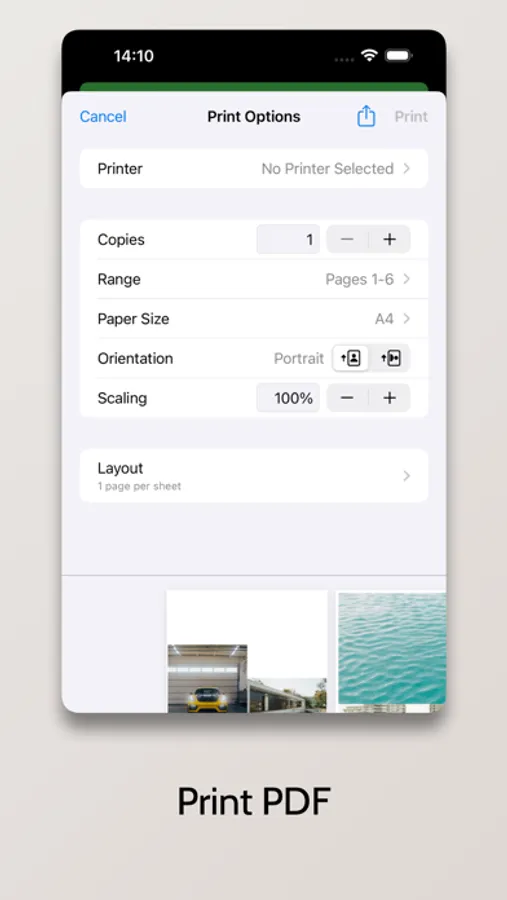 Save and organize your PDF files with Folders Structure in the app, and share or print them in A4 or Letter page size. You can also email, print, or send PDF files to Adobe Reader or another app, and directly upload them to iCloud Drive, Google Drive, Dropbox, or OneDrive.