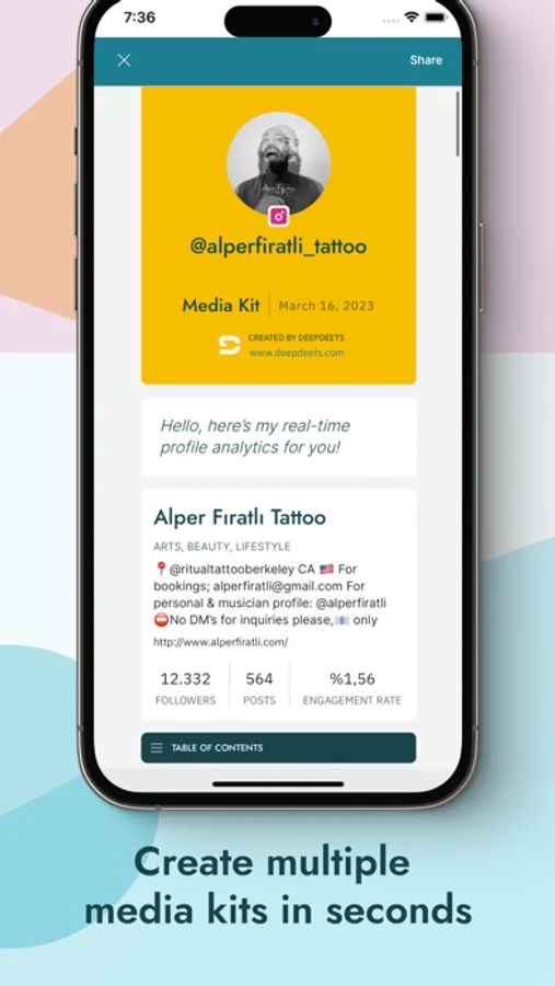 → Instantly create multiple media kits with real-time insights, graphics and personal info