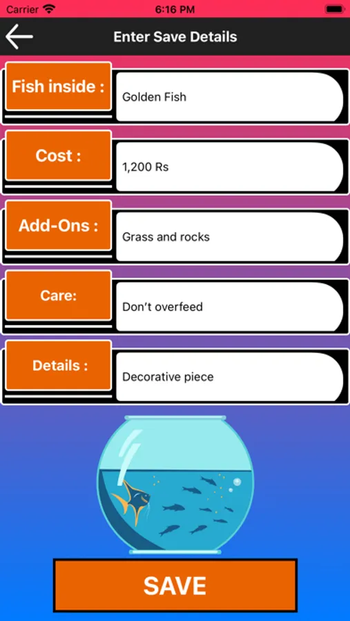 On choosing the category of aquarium, user can add the details of aquariums they have.
