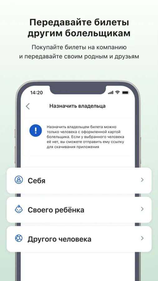 Назначайте билеты на себя и других людей, у которых есть карта болельщика. Создавайте детские билеты без места, привязанные к билету взрослого