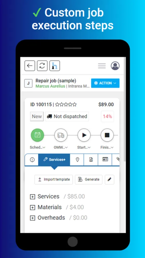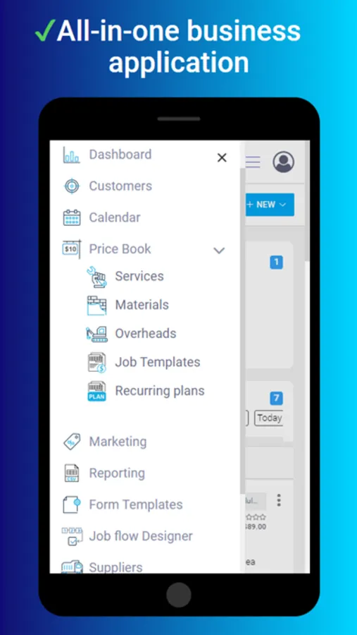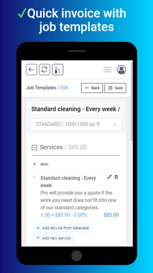 Accurate bids/estimates, Fast adjustable job templates, Discount per item / per section / per job, Price Book for services / supplies / overheads / job templates / recurring plans.