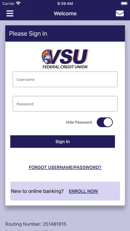 • To sign in to mobile banking, use your VSU FCU Online Banking username and password. If you have not established these yet, select "Enroll now" to get started.