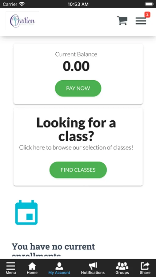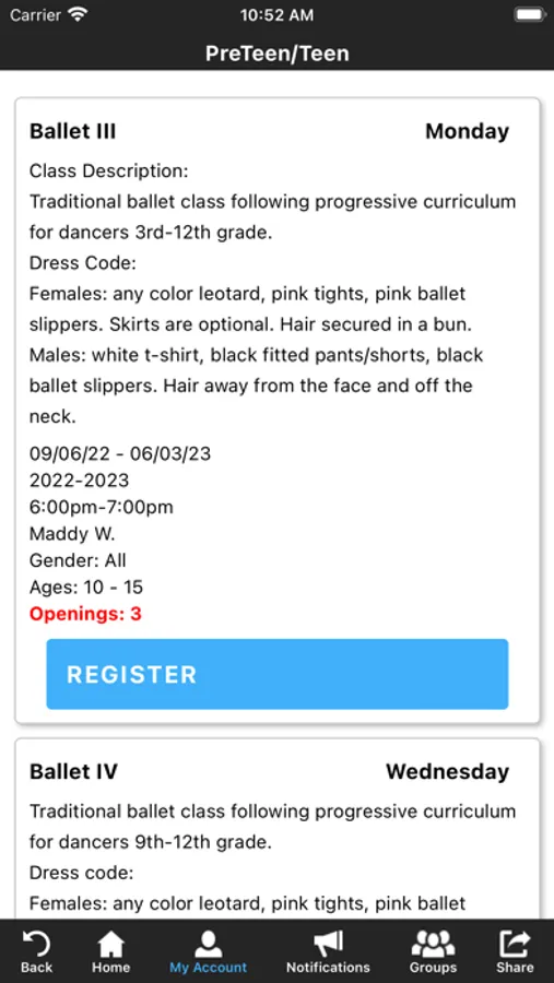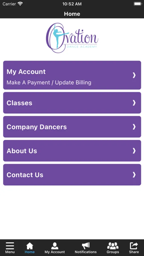 The Ovation Dance Academy app allows you to manage your account with ease, register for classes, update your personal information, and manage your payment methods. You'll also receive important notifications about class changes, closings, registration openings, special announcements, and upcoming events.