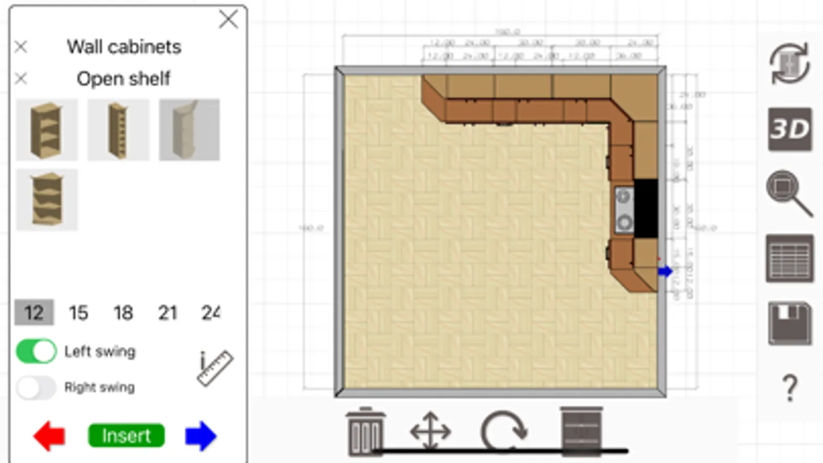Step 2: Drag and drop cabinets, appliances and accessories in the design. Items will automatically rotate when touching a wall and will stick to other inserted items when you move them.