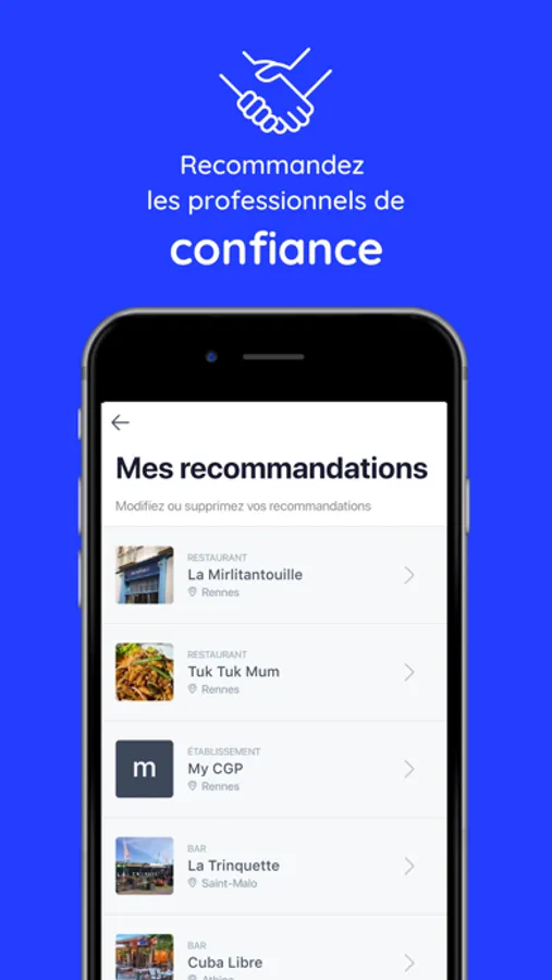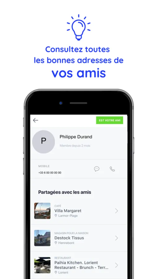 Constituez votre liste des meilleures recommandations pour les retrouver à tout moment, où que vous soyez. Vous aurez un carnet d'adresses dans votre poche.