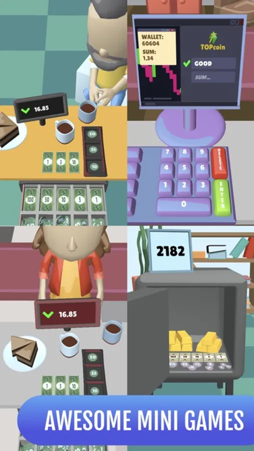Try yourself as an employee of the Currency Exchanger. Exchange various money, pay by card, withdraw money from an ATM and in a safe.