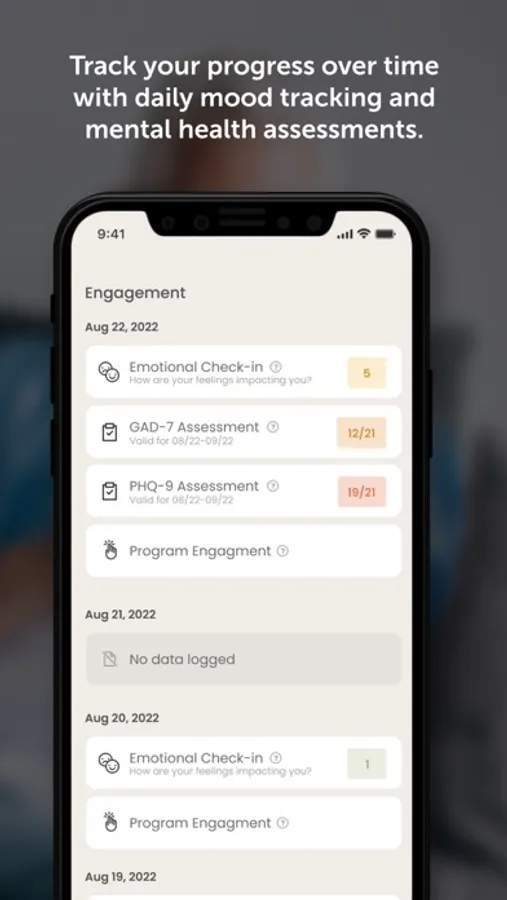 • You now have greater insight into your progress! We have added a health data tab to the client dashboard, offering you anytime access to your clinical assessment results and previously logged moods, as well as insight into your progress and compliance with your program.