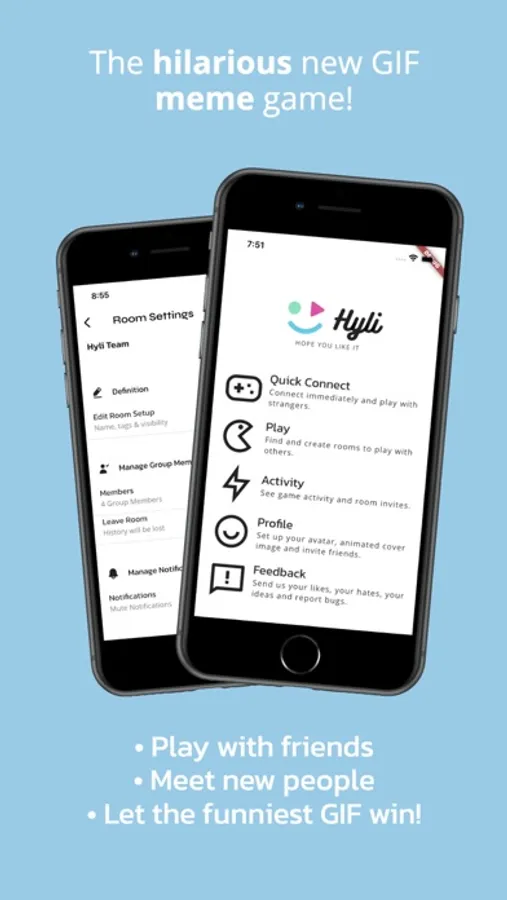 Hyli is is a new game in which players are prompted with fill-in-the-blank style cards and each player chooses the funniest GIF which they think will take the round.