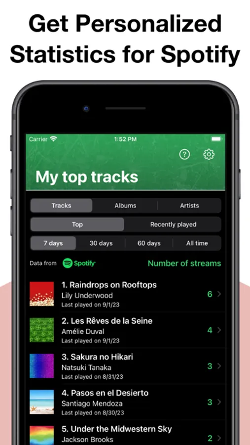 • GET PERSONALIZED STATISTICS FOR SPOTIFY: discover your top tracks, artists, and albums.
